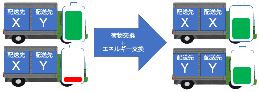 本研究で提案するシステムは,物流の配送過程において配送センターから配送センターへの荷物の配送の際に,特定の条件を満たした時に限りEV同士をマッチングさせ,EV同士が荷物の交換とエネルギーの交換を行うことで物流をより効率化させるものである.