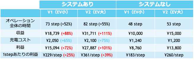 パラメータを[5][6]を参考に設定し,数値シミュレーションを行った結果以下のグラフと表のような結果が得られた.数値シミュレーションから提案システムがない状況よりも提案システムがある状況の方がオペレーション全体で運ぶことができる荷物の数が増加している.そして,運ぶことができる荷物量の増加に伴い,1日のオペレーションによる収益が増加していることがわかる.また単位時間あたりの利益が増加していることから,荷物交換とV2Vによるエネルギー交換により,オペレーション全体の効率が向上していることが読み取れる.